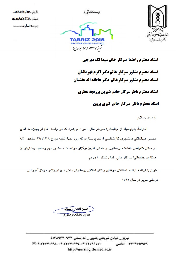 جلسه دفاع از پایاننامه آقای محسن عبدالملکی، دانشجوی کارشناسی ارشد پرستاری
