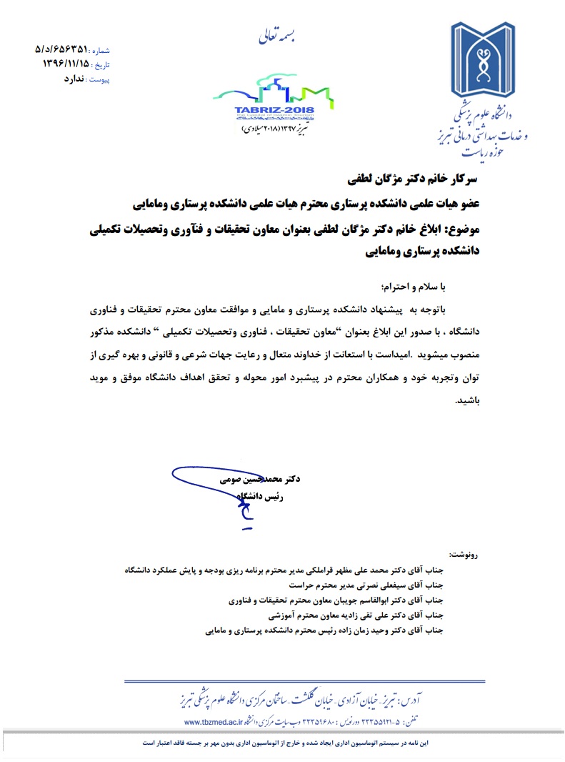 بر اساس ابلاغ ریاست محترم دانشگاه، سرکار خانم دکتر مژگان لطفی، عضو هیأت علمی گروه پرستاری داخلی جراحی دانشکده، بعنوان معاونت تحقیقات و فناوری و تحصیلات تکمیلی دانشکده منصوب گردیدند. این انتصاب را خدمت ایشان تبریک عرض نموده، توفیق روزافزون ایشان را از درگاه خداوند منان خواستاریم.