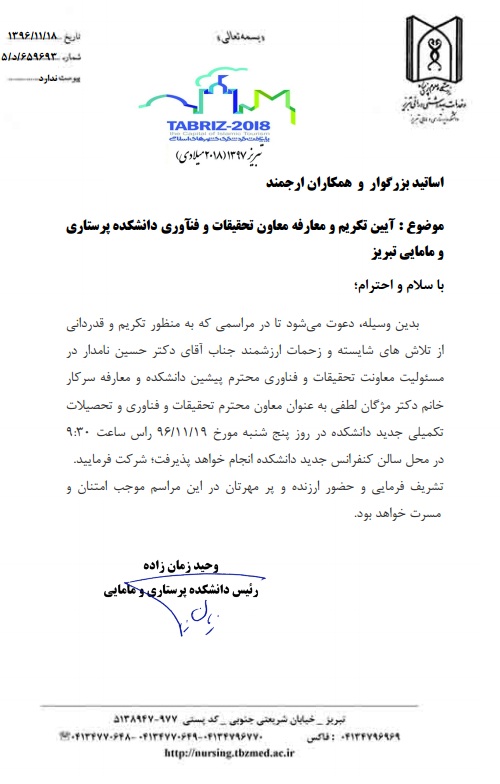 بدینوسیله دعوت میشود تا در مراسمی که بمنظور تکریم و قدردانی از تلاشهای شایسته و زحمات ارزشمند جناب آقای دکتر حسین نامدار در مسئولیت معاونت تحقیقات و فناوری محترم پیشین دانشکده و ...