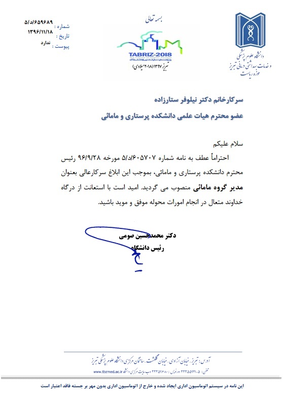 انتصاب سرکار خانم دکتر نیلوفر ستارزاده بعنوان مدیر گروه مامایی