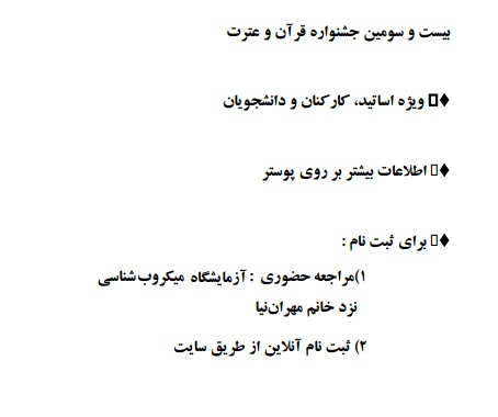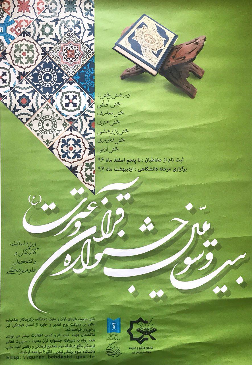 بیست و سومین جشنواره قران و عترت، ویژه اساتید، کارکنان و دانشجویان علوم پزشکی در شش بخش آوایی، معارف، هنری، پژوهشی، فناوری و ادبی برگزار خواهد گردید.