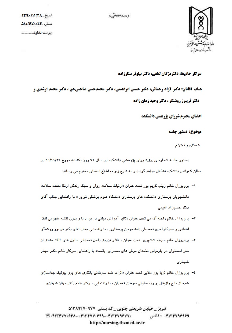 دستور جلسه سی اُمین شورای پژوهشی دانشکده در سال 96؛ یکشنبه 29 بهمن