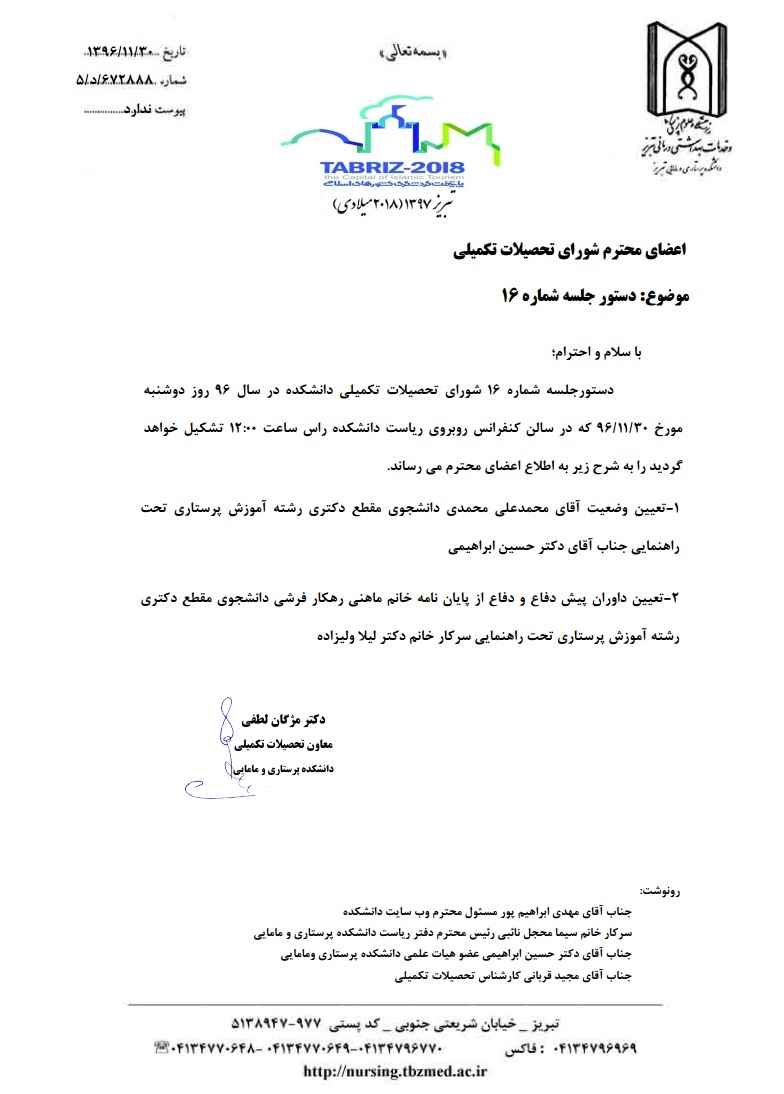 دستور جلسه شانزدهمین جلسه شورای تحصیلات تکمیلی دانشکده در سال 96؛ دوشنبه 30 بهمن