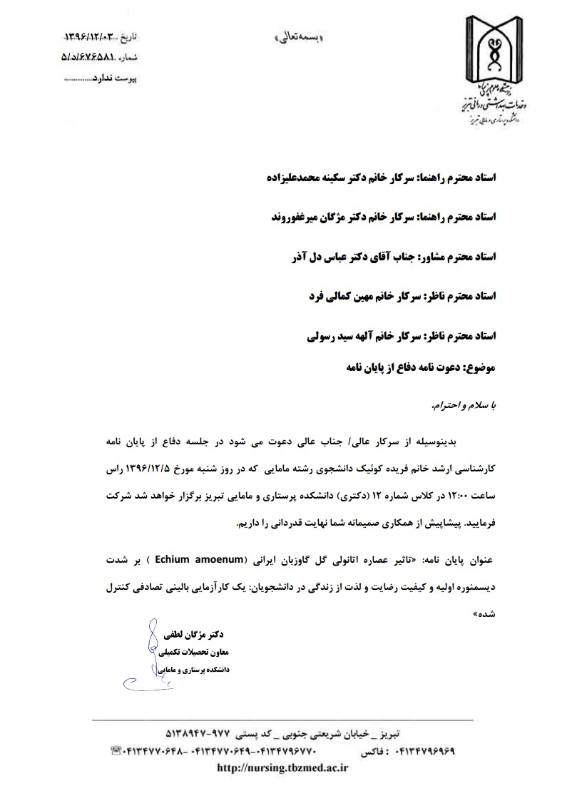 جلسه دفاع از پایاننامه خانم فریده کوئیک، دانشجوی کارشناسی ارشد مامایی