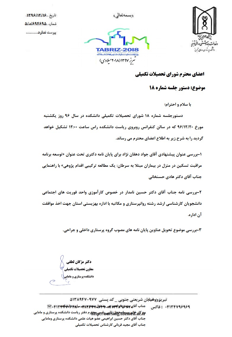 دستورجلسه هجدهمین جلسه شورای تحصیلات تکمیلی دانشکده در سال 96؛ یکشنبه 20 اسفند
