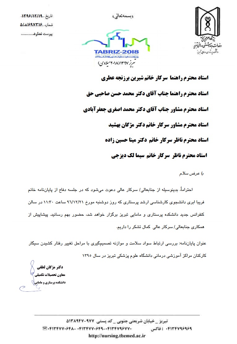 جلسه دفاع از پایاننامه خانم فریبا ابری، دانشجوی کارشناسی ارشد پرستاری