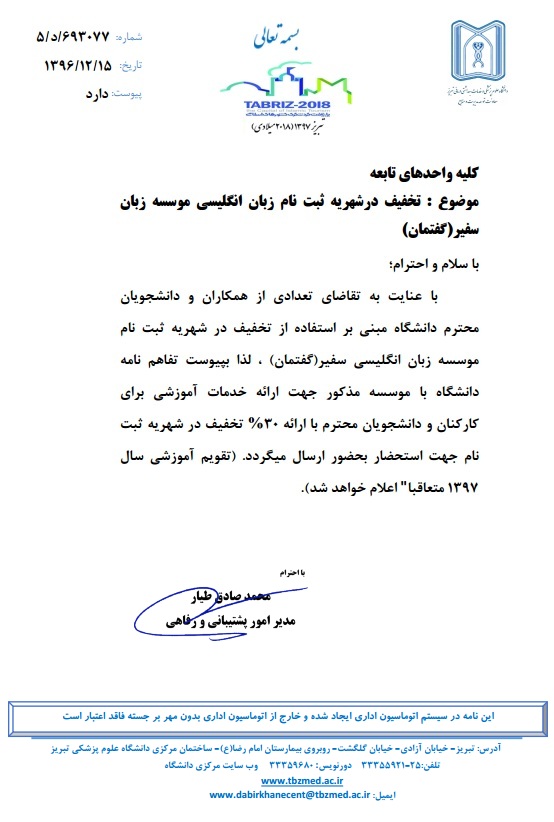 با عنایت به تقاضای تعدادی از همکاران و دانشجویان محترم دانشگاه مبنی بر استفاده از تخفیف در شهریه ثبت نام موسسه زبان انگلیسی سفیر (گفتمان)، به پیوست تفاهم نامه دانشگاه با ...