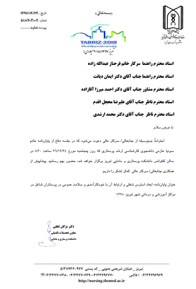 جلسه دفاع از پایاننامه خانم سونیا عازمی، دانشجوی کارشناسی ارشد پرستاری
