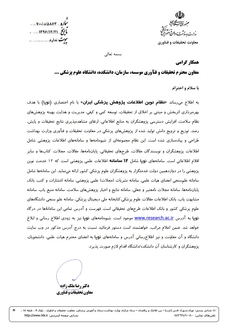 به اطلاع می رساند نظام نوین اطلاعات پزوهش پزشکی ایران با نام اختصاری (نوپا) با هدف بهره برداری اثربخش و مبتنی بر اخلاق از تحقیقات، توسعه کمی و کیفی، مدیریت و هدایت بهینه پژوهشهای نظام سلامت و ...