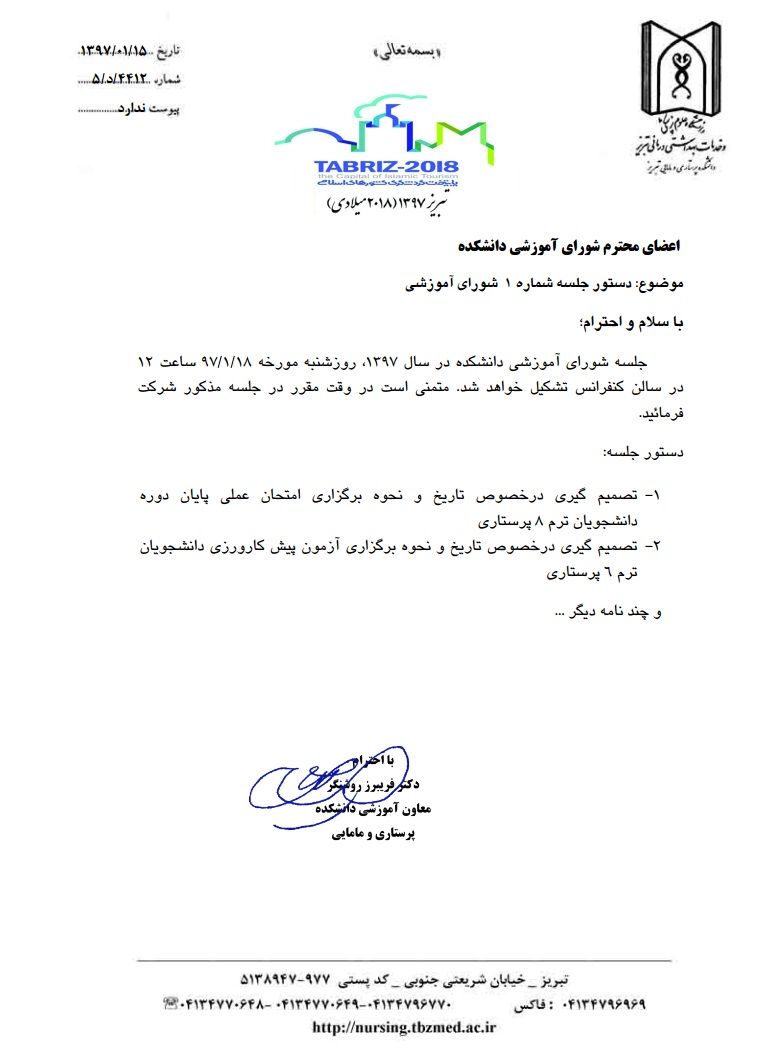 روز شنبه مورخه 18 فروردین 97، اولین جلسه شورای آموزشی دانشکده برگزار خواهد گردید.