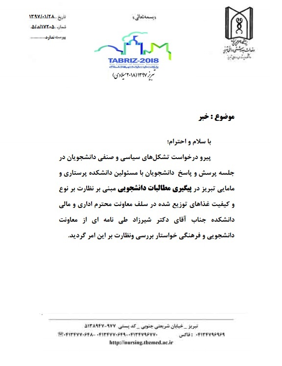 پیرو درخواست تشکل های سیاسی و صنفی دانشجویان در جلسه پرسش و پاسخ دانشجویان با مسئولین دانشکده پرستاری و مامایی در پیگیری مطالبات دانشجویی مبنی بر نظارت بر نوع و کیفیت غذاهای توزیع شده ...