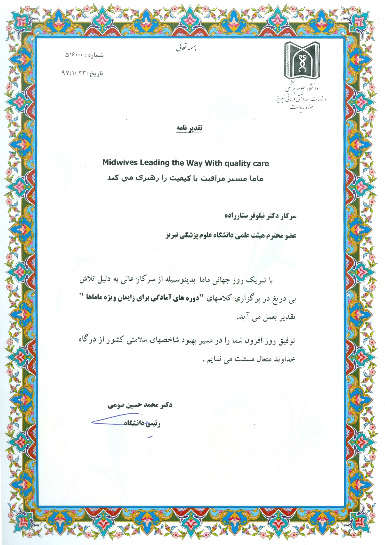 ریاست محترم دانشگاه با اهداء لوحی از فعالیتهای سرکار خانم دکتر نیلوفر ستارزاده، مدیر گروه محترم مامایی دانشکده به جهت تلاشهای ایشان در برگزاری کلاسهای "دوره های آمادگی برای زایمان ویژه ماماها" تقدیر و تشکر نمودند.