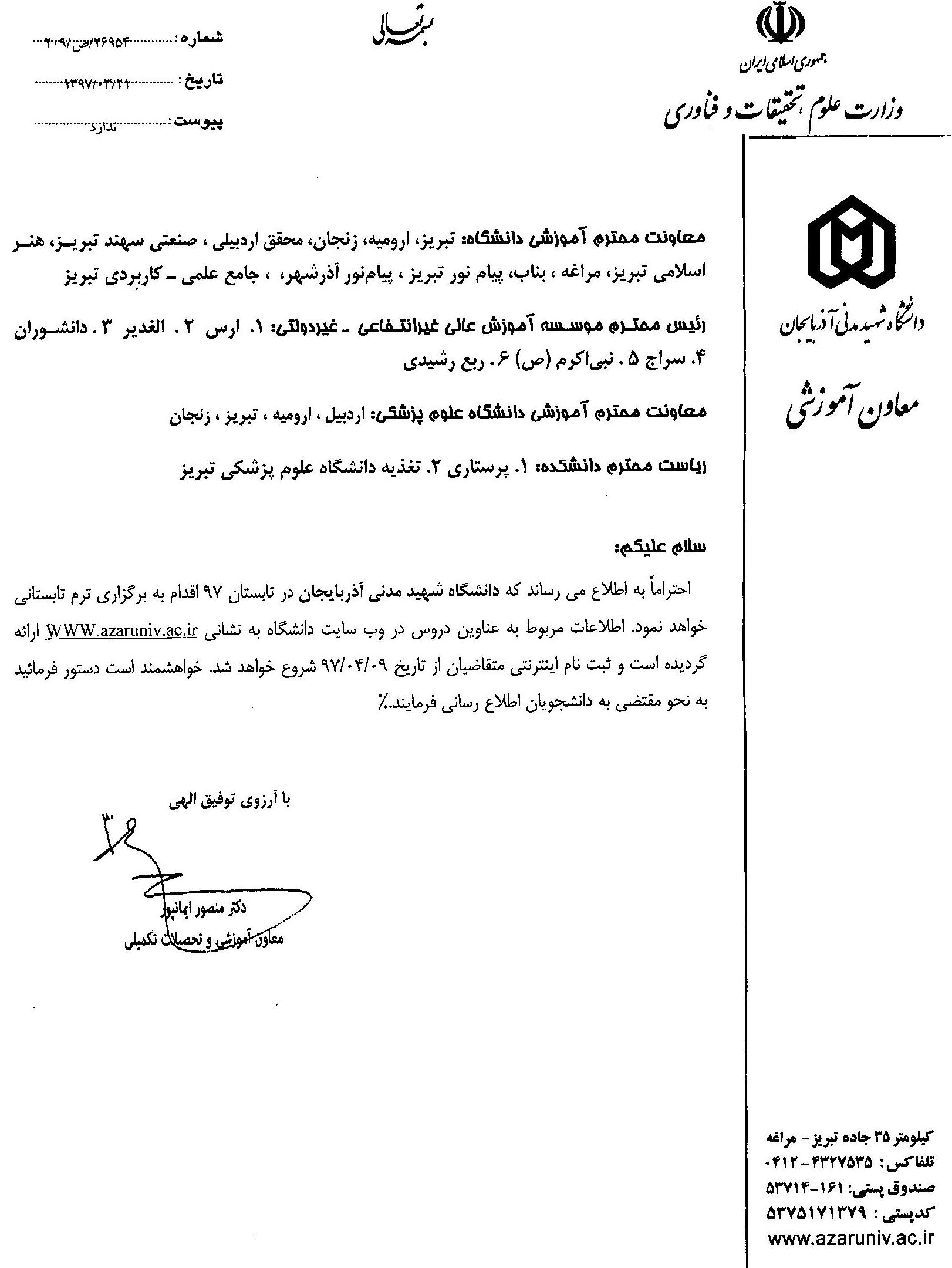 اطلاعیه دانشگاه شهید مدنی آذربایجان درخصوص برگزاری ترم تابستانی