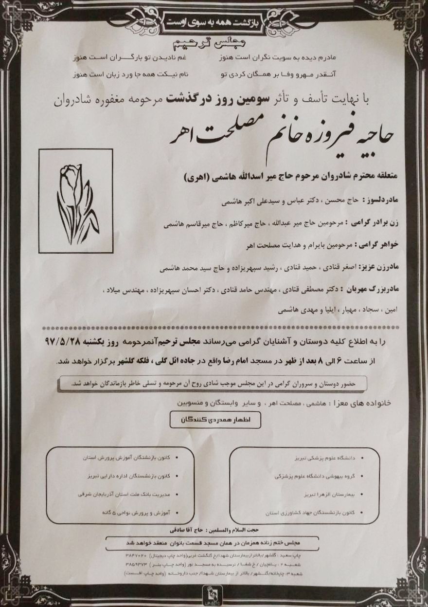 مجلس ترحیم سوّمین روز درگذشت مادرِ همسر سرکار خانم دکتر شهنازی