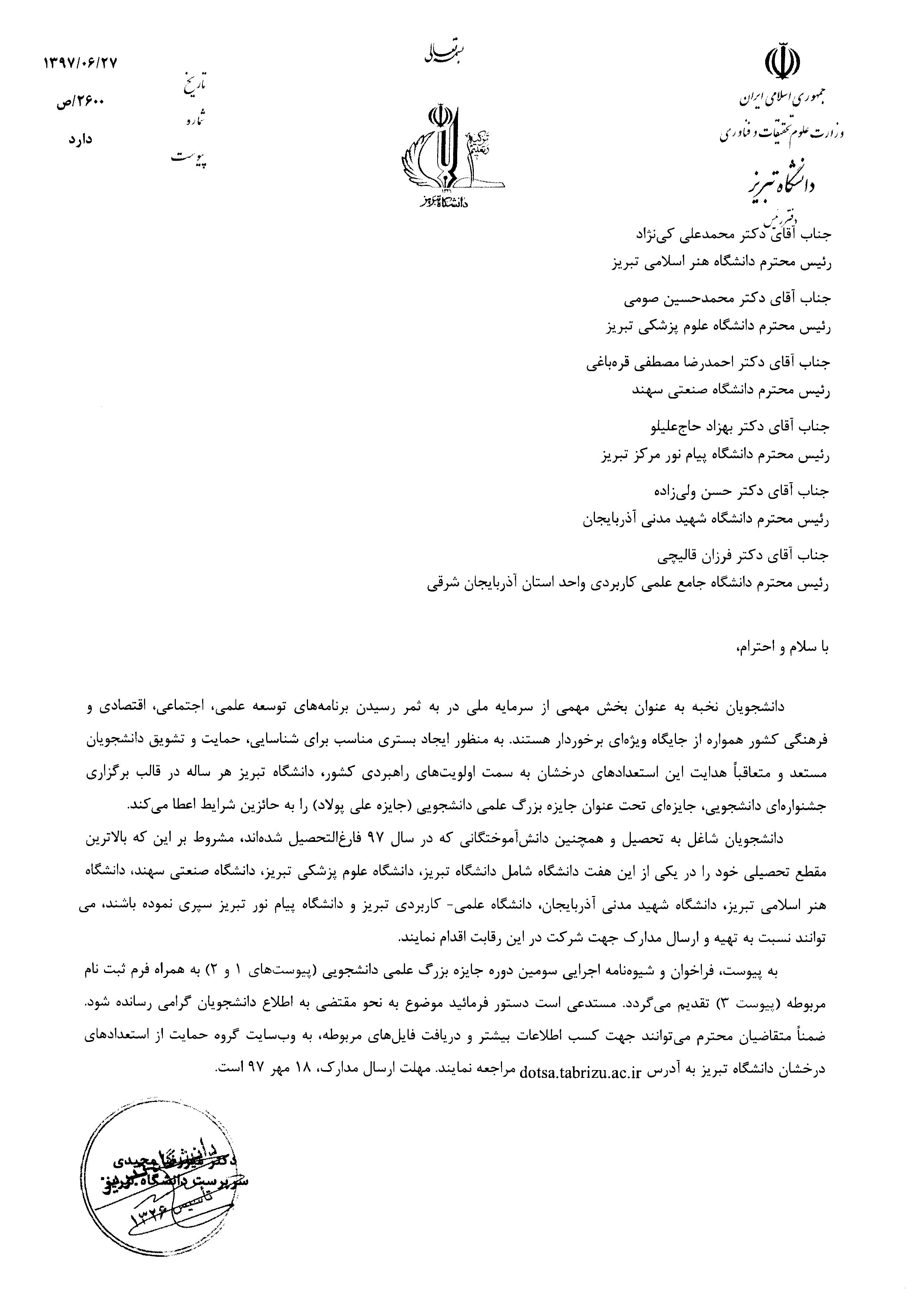 اطلاع رسانی درخصوص شرکت در سومین دوره "جایزه بزرگ علمی" دانشگاه تبریز