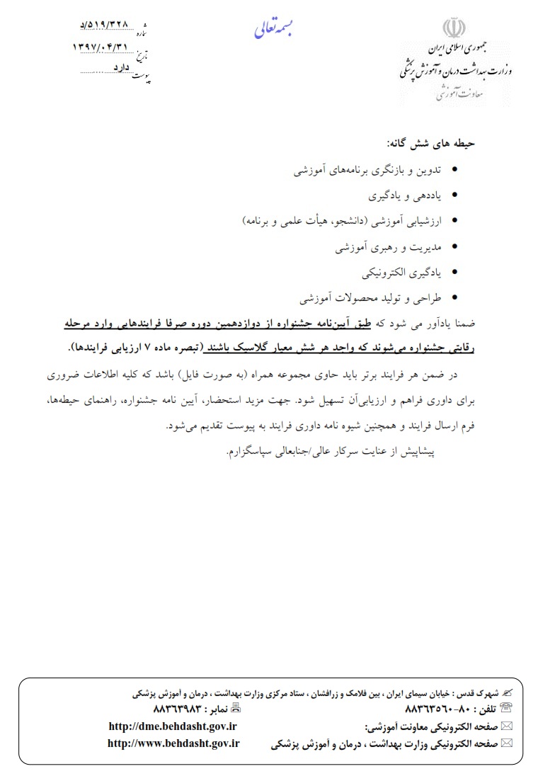 به استحضار میرساند به منظور ایجاد فرصت مناسب برای تشویق و ترغیب اعضای محترم هیأت علمی جهت مشارکت حداکثری برای ارسال فرآیند در دوازدهمین جشنواره آموزشی شهید مطهری، برنامه ریزی شده که از هم اکنون طبق آیین نامه جشنواره ...