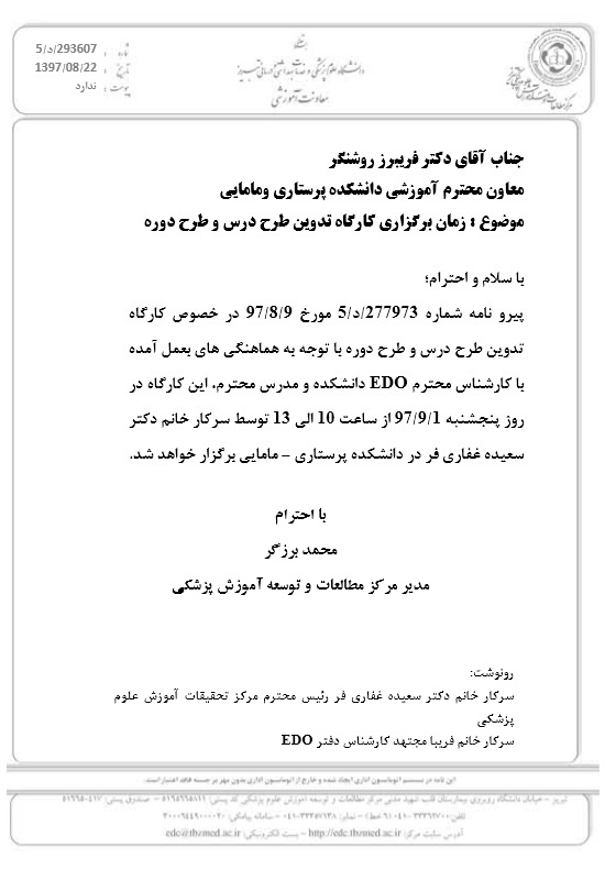 به اطلاع می رساند کارگاه تدوین طرح درسی و طرح دوره، روز پنجشنبه مورخه 1 آذر 97، از ساعت 10 الی 13 توسط سرکار خانم دکتر سعیده غفاری فر در دانشکده پرستاری و مامایی برگزار خواهد گردید.