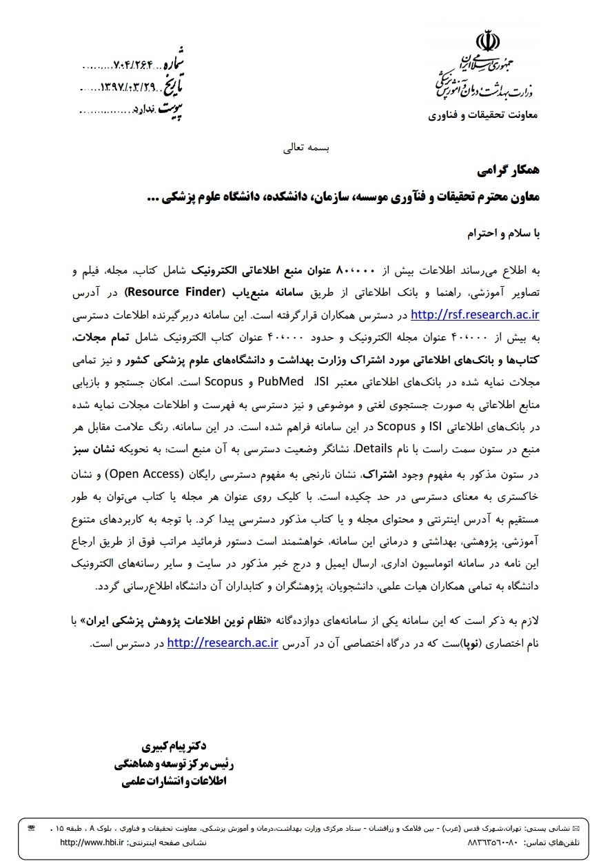 به اطلاع می رساند اطلاعات بیش از 80000 عنوان منبع اطلاعاتی الکترونیک شامل کتاب، مجله، فیلم و تصاویر آموزشی، راهنما و بانک اطلاعاتی از طریق سامانه منبع یاب (Resource Finder) در ادرس ...