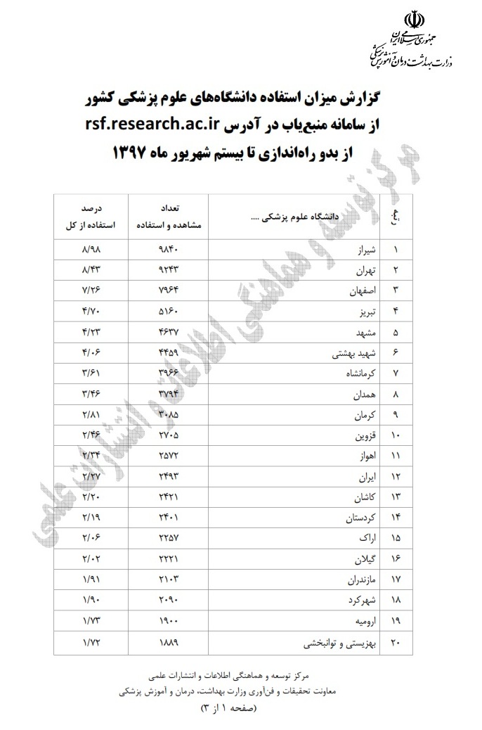 گزارش میزان استفاده دانشگاه های علوم پزشکی کشور از سامانه منبع یاب