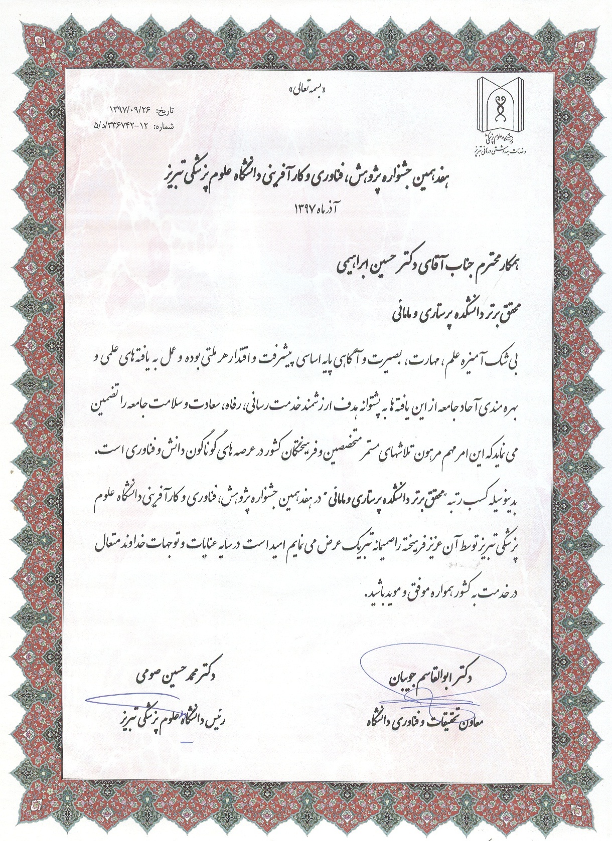 بدین وسیله کسب رتبۀ "محقق برتر دانشکده" توسط جناب آقای دکتر حسین ابراهیمی، عضو محترم هیأت علمی گروه روانپرستاری در هفدهمین جشنواره پژوهش، فناوری و کارآفرینی دانشگاه علوم پزشکی تبریز را خدمت ایشان، خانواده محترم ایشان و کلیه همکاران محترم دانشکده تبریک و تهنیت عرض نموده، توفیق روزافزونشان را از درگاه خداوند منان خواستاریم.