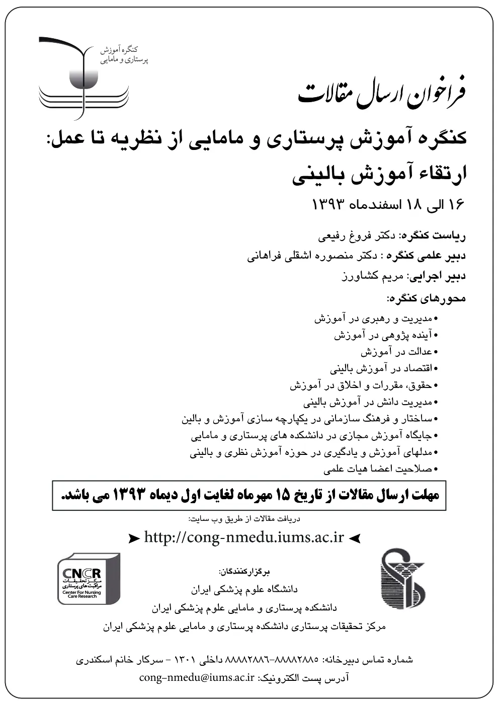 دانشگاه علوم پزشکی ایران در نظر دارد روزهای 16 لغایت 18 اسفندماه سال جاری، کنگره ای را تحت عنوان "آموزش پرستاری و مامایی: از نظریه تا عمل" برگزار نماید. مهلت ارسال مقالات تا یک دیماه می باشد. جهت ارسال مقالات از اینجا اقدام نمائید.