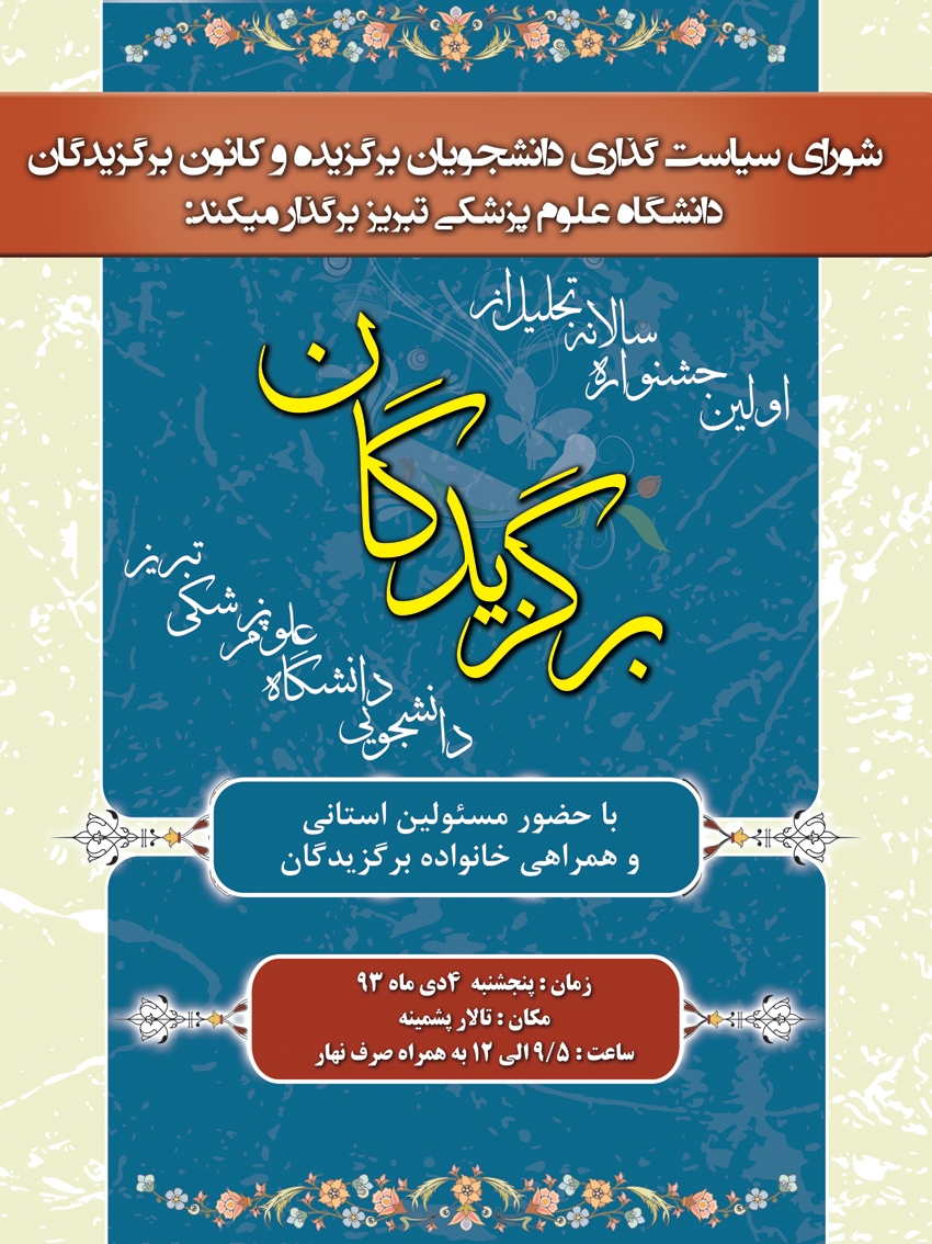 اولین همایش تجلیل از برگزیدگان دانشگاه علوم پزشکی تبریز با رویکرد حمایت از برگزیدگان علمی، آموزشی، فرهنگی و ورزشی دانشگاه، با حمایت مستقیم ریاست محترم دانشگاه و زیر نظر معاونت تحقیقات و فناوری، معاونت آموزشی و معاونت فرهنگی دانشجویی دانشگاه و با حضور مسئولین استانی و همراهی خانواده های برگزیدگان دانشگاه برگزار خواهد شد. دانشجویان برگزیده ای که قرار است امسال در این مراسم از آنها تقدیر بعمل آید، بر اساس آیین نامه مصوب شورای سیاست گذاری برگزیدگان دانشگاه در دو سطح یک و دو قرار می گیرند.