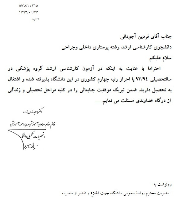 جناب آقای فردین آجودانی، دانشجوی کارشناسی ارشد پرستاری داخلی-جراحی احراز رتبه چهارم کشوری در آزمون کارشناسی ارشد گروه پزشکی در سال تحصیلی 94/93 را از طرف ریاست و مسئولین دانشکده تبریک عرض نموده و موفقیت جنابعالی در تمام مراحل زندگی را از خداوند منان خواستاریم.