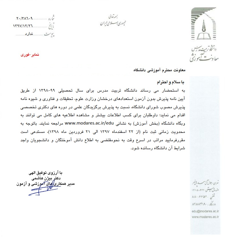 اطلاعیه پذیرش بدون آزمون دانشگاه تربیت مدرس برای دوره های دکتری تخصصی