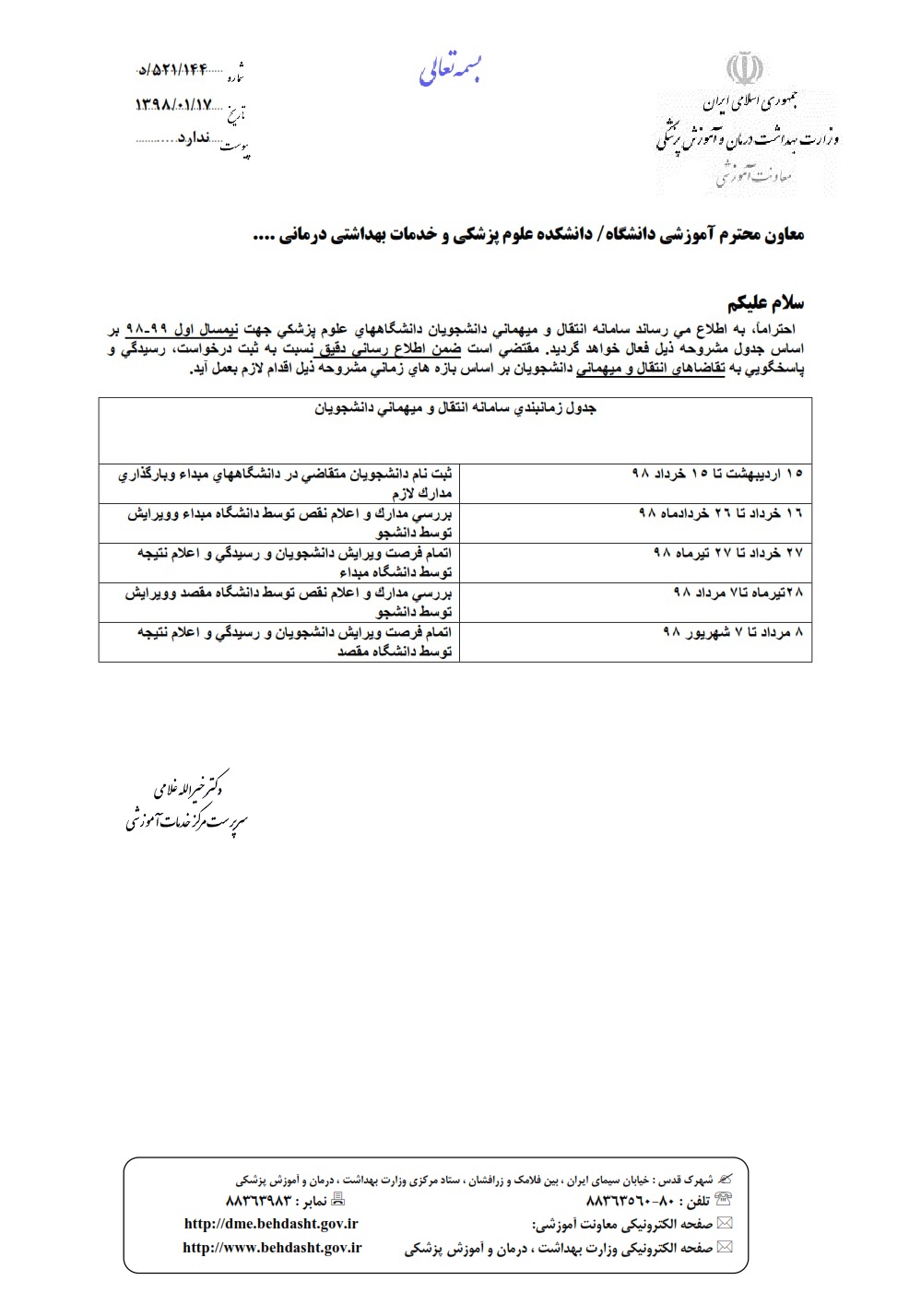 بر اساس اعلام سرپرست مرکز خدمات آموزشی وزارت بهداشت، سامانه انتقال و میهمانی دانشجویان دانشگاه های علوم پزشکی جهت نیمسال اول 99-98 بر اساس جدول مشروحه ذیل فعال خواهد گردید. مقتضی است نسبت به درخواست، رسیدگی و پاسخگویی به تقاضاهای انتقال و میهمانی ...