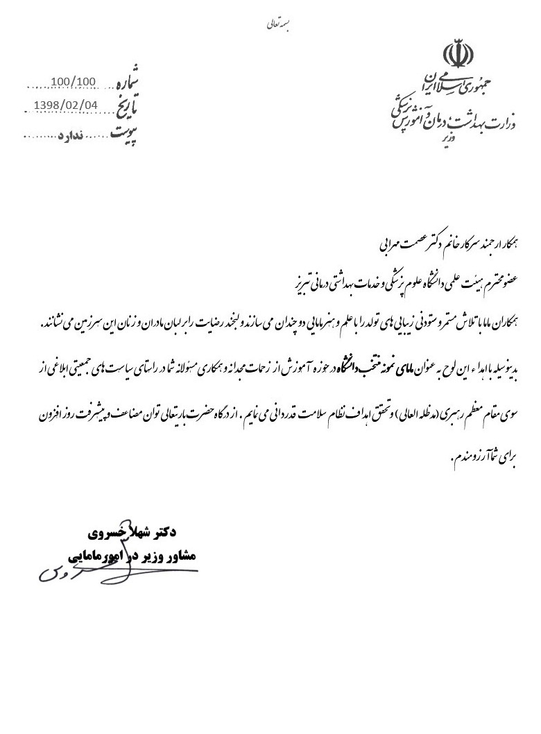 تبریکِ انتخاب سرکار خانم دکتر مهرابی بعنوان مامای نمونه منتخب دانشگاه