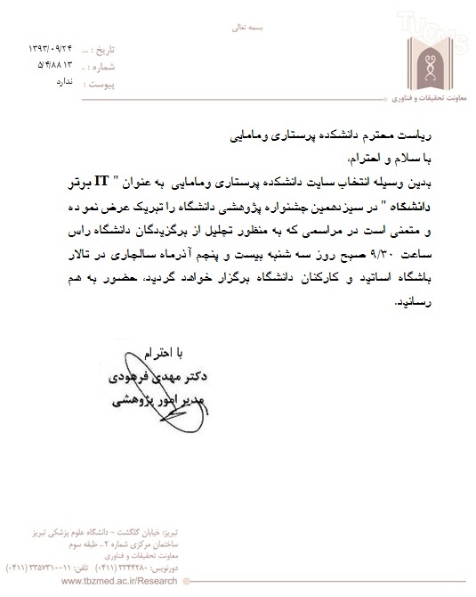 بدینوسیله انتخاب واحد IT دانشکده پرستاری و مامایی تبریز بعنوان IT برتر دانشگاه در سیزدهمین جشنواره پژوهشی دانشگاه را حضور ریاست محترم، معاونین گرامی و کلیه همکاران ارجمند اعم از اعضای محترم هیأت علمی، آموزشی و کارمندان عزیز و پرتلاش دانشکده تبریک عرض نموده، از درگاه خداوند منان آرزوی موفقیت و توفیقات روزافزون داریم.