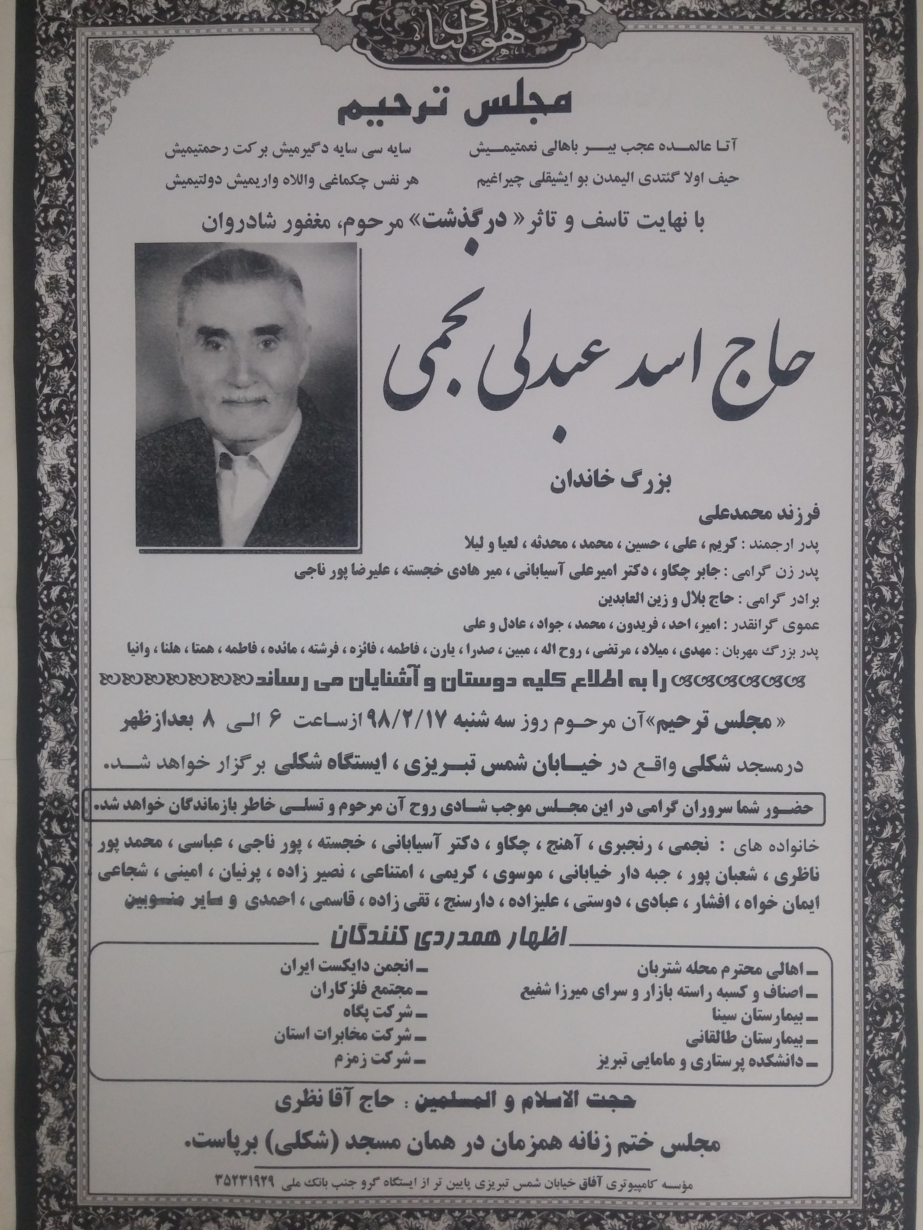 با نهایت تأسف و تأثر درگذشت مرحوم مغفور شادروان جناب آقای حاج اسد عبدلی نجمی، پدر بزرگوار همکار عزیزمان سرکار خانم لیلا عبدلی نجمی را خدمت ایشان و خانواده محترمشان تسلیت و تعزیت عرض نموده، علو درجات را از درگاه خداوند منان برای آن عزیز از دست رفته خواستاریم.