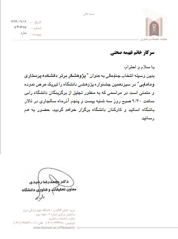 بدیونوسیله انتخاب سرکار خانم فهیمه صحتی، استادیار گروه مامایی را بعنوان پژوهشگر برتر دانشکده پرستاری و مامایی تبریز در سیزدهمین جشنواره پژوهشی دانشگاه را خدمت ایشان، خانواده محترم ایشان و تمامی همکاران گرامی دانشکده تبریک و تهنیت عرض می نمائیم.