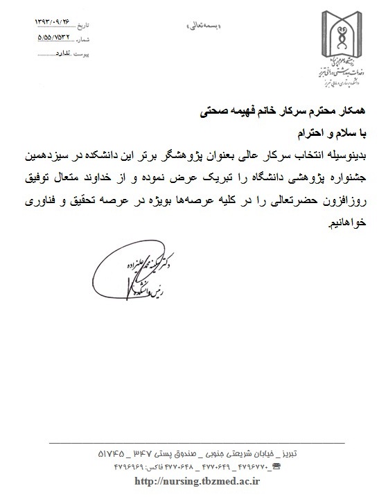 ریاست محترم دانشکده طی ارسال نامه ای انتخاب سرکار خانم صحتی بعنوان پژوهشگر برتر دانشکده