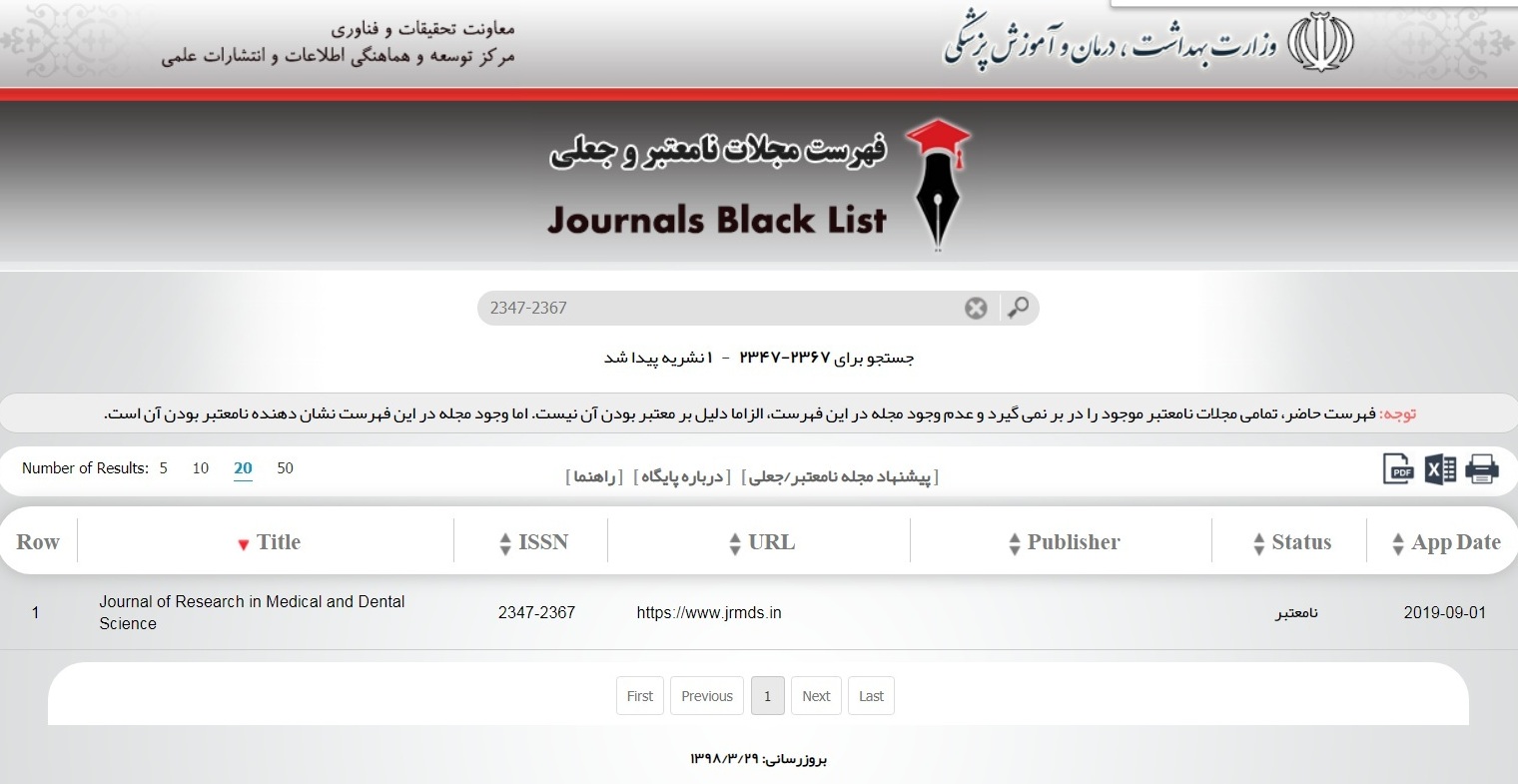 بر اساس مستندات ارائه شده در فهرست مجلات نامعتبر و جعلی وزارت بهداشت، درمان و آموزش پزشکی به آدرس اینترنتی http://blacklist.research.ac.ir/index.php مجله به نام Journal of Research in Medical and Dental Science بشماره ISSN:2347-2367 و به آدرس اینترنتی http://https//www.jrmds.in از مورخه 2019/09/01 در لیست مجلات نامعتبر قرار خواهد گرفت.