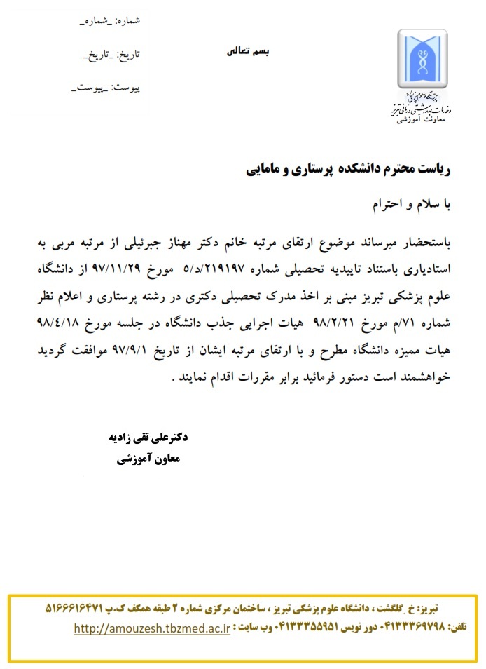 بدین وسیله ارتقای مرتبه علمی سرکار خانم دکتر مهناز جبرئیلی، عضو هیات علمی گروه پرستاری کودکان از مربی به استادیاری را خدمت ایشان و خانواده محترم ایشان و کلیه همکاران محترم دانشکده تبریک و تهنیت عرض نموده، توفیق روزافزونشان را از درگاه خداوند منان خواستاریم.