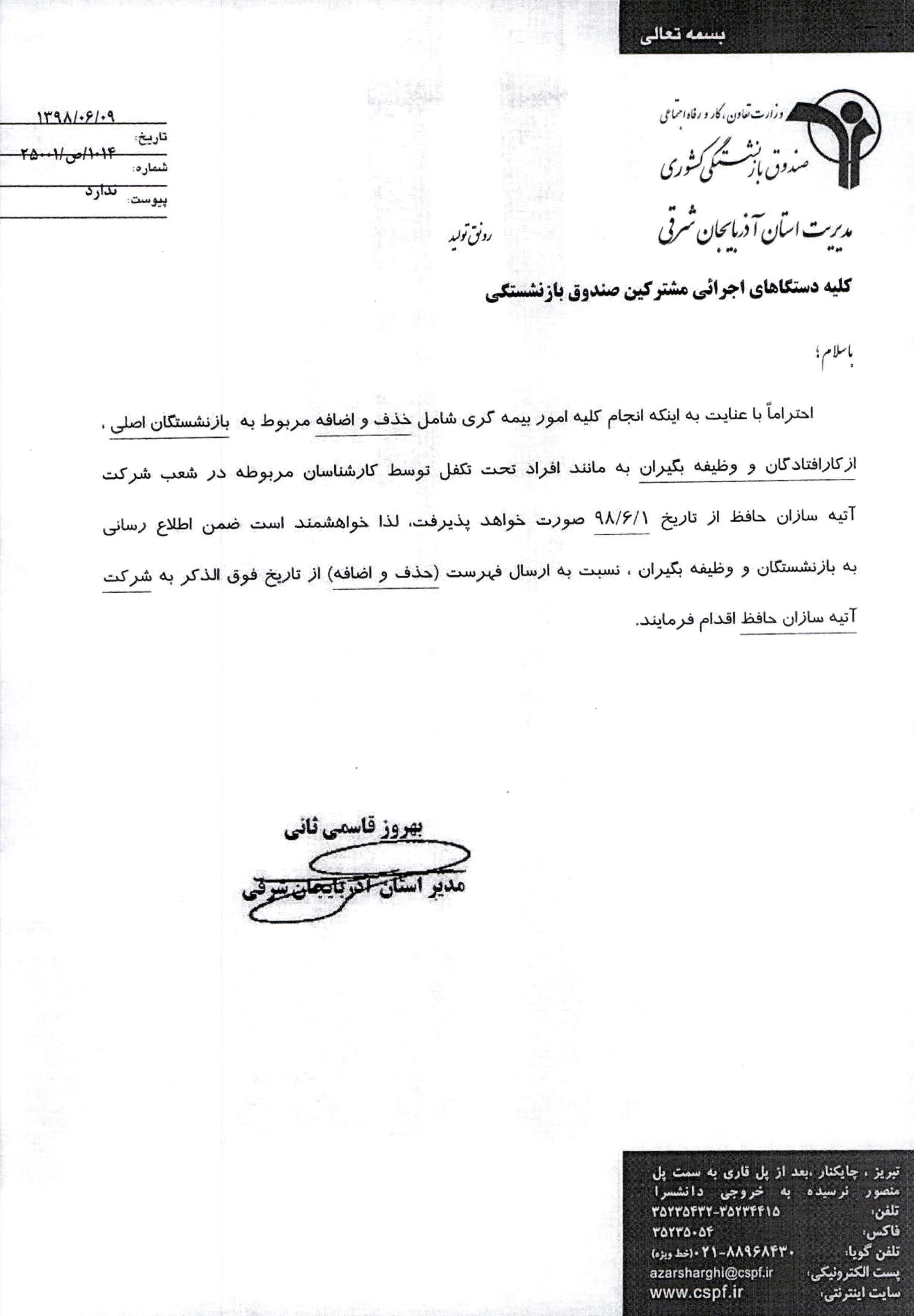 احتراماً با عنایت به اینکه انجام کلیه امور بیمه گری شامل حذف و اضافه مربوط به بازنشستگان اصلی، از کار افتادگان و وضیفه بگیران به مانند افراد تحت تکفل توسط کارشناسان مربوطه در ضعب شرکت آتیه سازان حافظ از تاریخ 1 شهریور 98 صورت خواهد پذیرفت، لذا ...