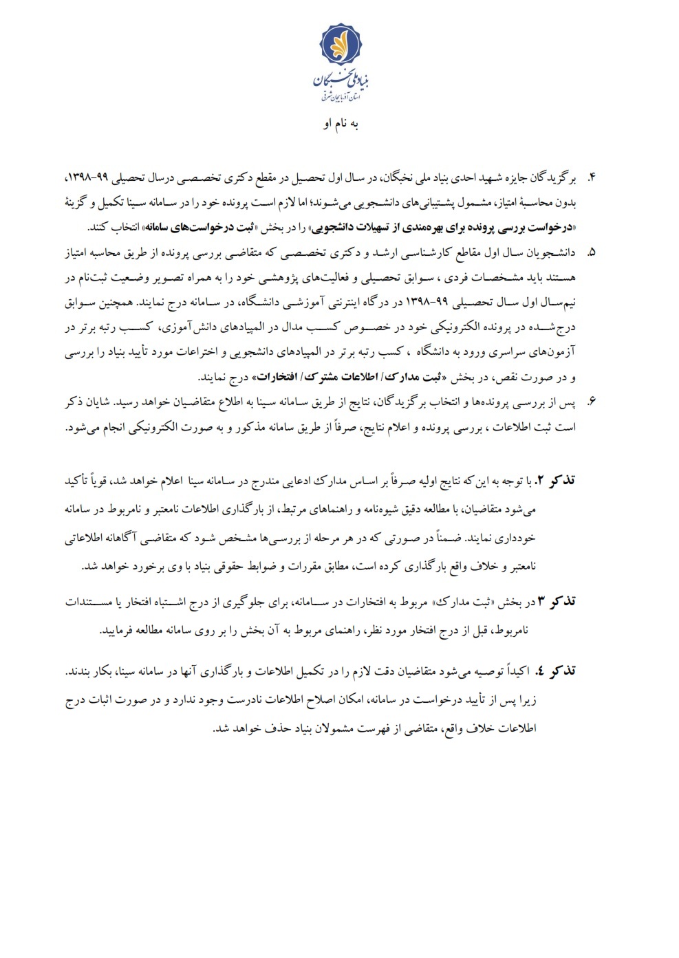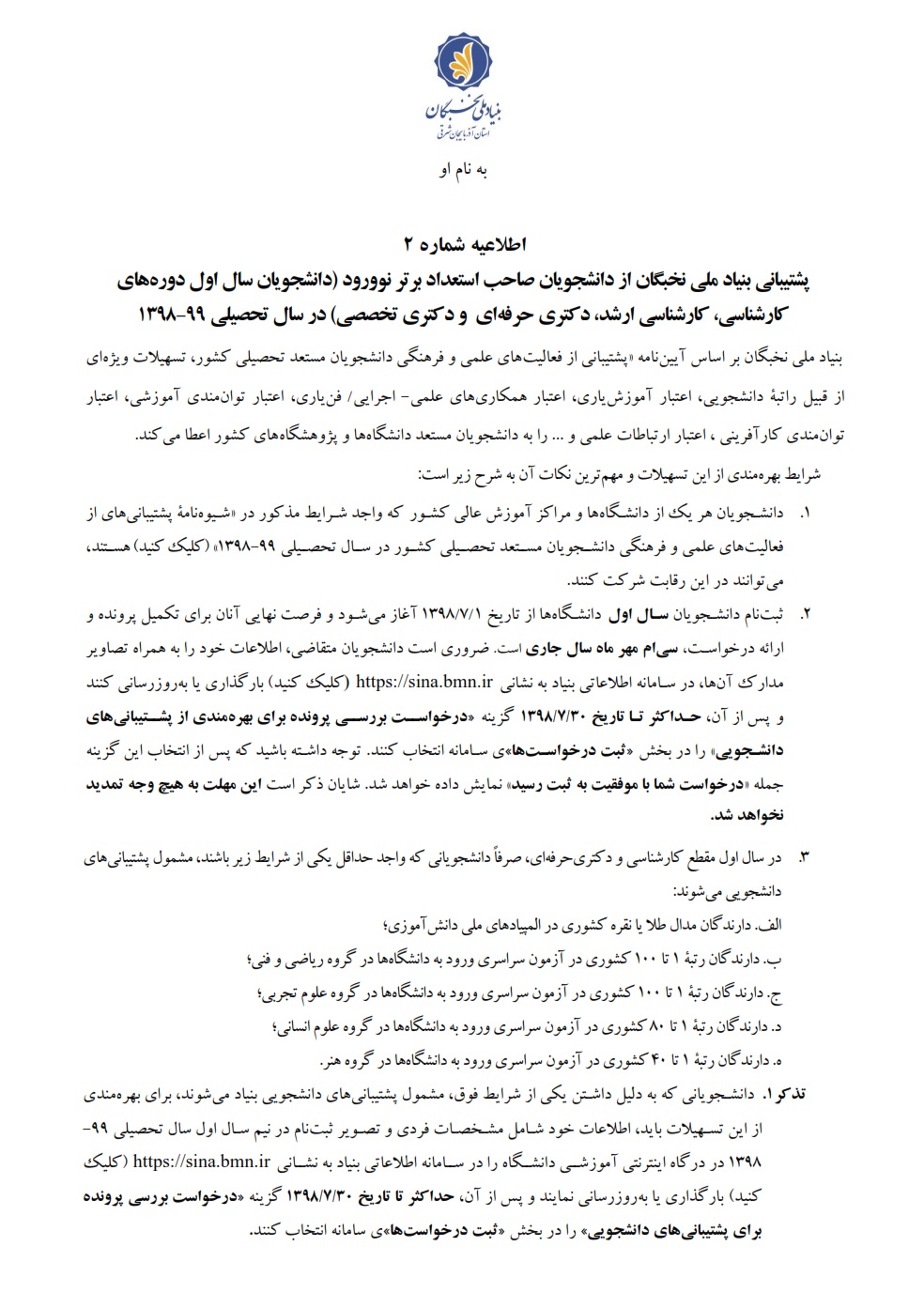 پشتیبانی بنیاد ملی نخبگان از دانشجویان صاحب استعداد برتر نو ورود