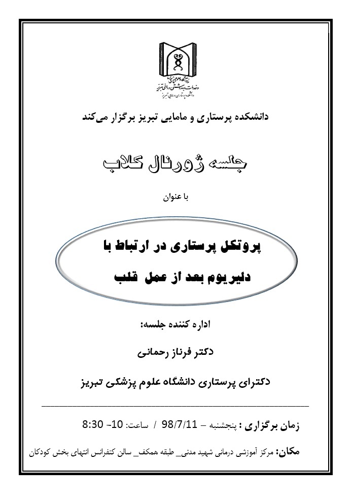 اطلاعیه برگزاری ژورنال کلاب "پروتکل پرستاری در ارتباط با دلیریوم بعد از عمل قلب"