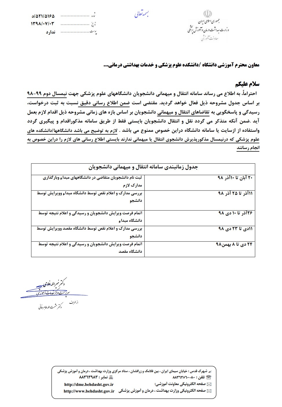 بر اساس اعلام سرپرست مرکز خدمات آموزشی وزارت بهداشت، سامانه انتقال و میهمانی دانشجویان دانشگاههای علوم پزشکی کشور جهت نیمسال دوم 99-98 بر اساس جدول مشورحه ذیل فعال خواهد گردید.