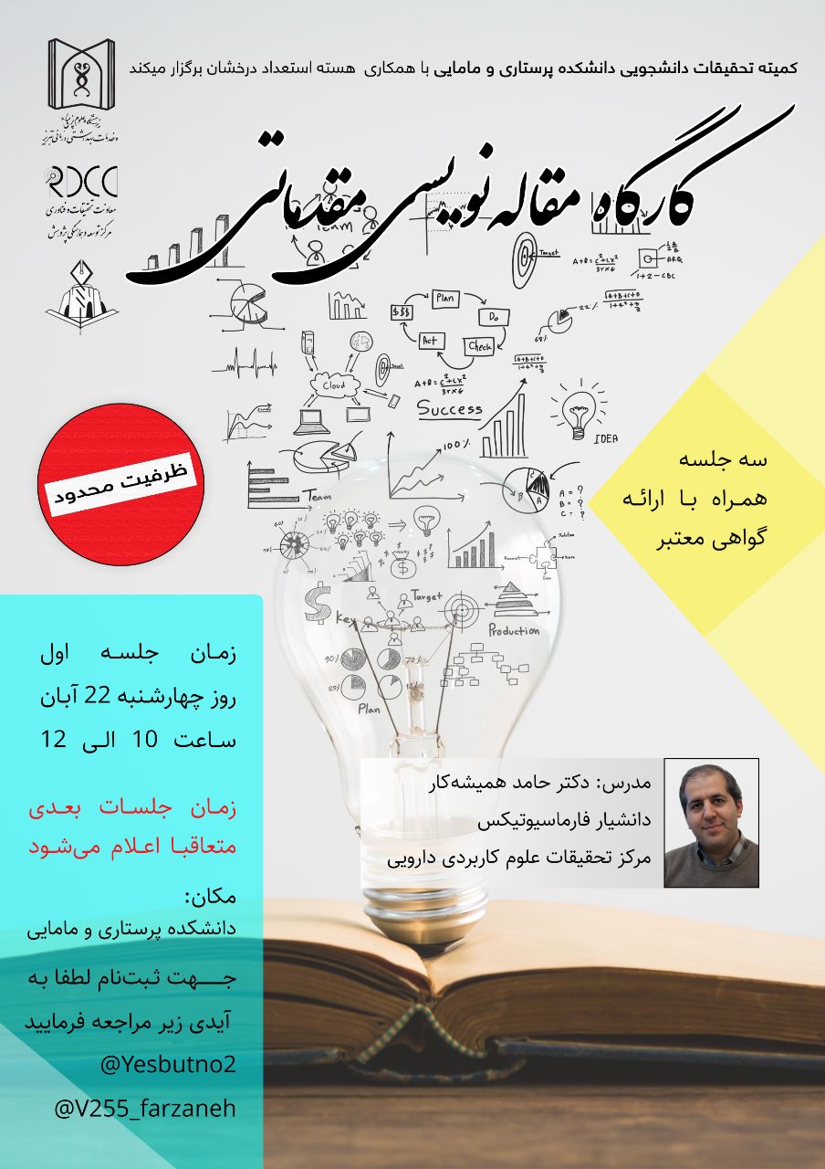 به اطلاع علاقمندان می رساند زمان برگزاری جلسات بعدی کارگاه مقاله نویسی مقدماتی با تدریس جناب آقای دکتر حامد همیشه کار (دانشیار فارماکوسیوتیکس) که به همت کمیته تحقیقات دانشجویی دانشکده و با همکاری هسته استعداد درخشان برگزار خواهد گردید، متعاقباً اعلام خواهد گردید.