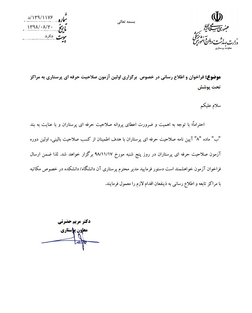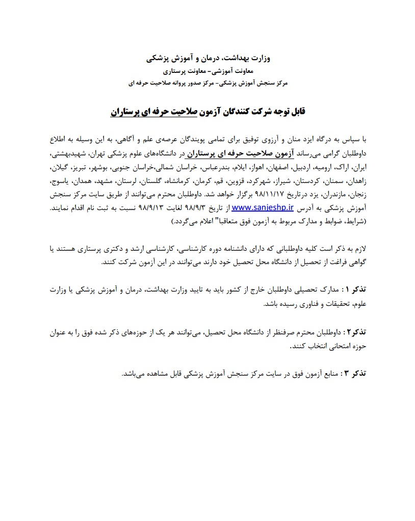 بر اساس اعلام معاون پرستاری وزیر، با توجه به اهمیت و ضرورت اعطای پروانه صلاحیت حرفه ای پرستاران و با عنایت به بند "ب" ماده 8 آئین نامه صلاحیت حرفه ای پرستاران و با هدف اطمینان از کسب صلاحیت بالینی، اولین دوره آزمون صلاحیت حرفه ای پرستاران در روز پنجشنبه مورخه 17 بهمن ماه 98 برگزار خواهد گردید.