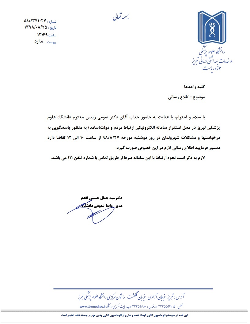 بر اساس اعلام روابط عمومی دانشگاه، جناب آقای دکتر صومی رییس محترم دانشگاه علوم پزشکی تبریز روز دوشنبه مورخه 27 آبان 98 از ساعت 10 الی 12 به منظور پاسخگویی به درخواستها و مشکلات شهروندان در محل استقرار سامانه الکترونیکی ارتباط مردم و دولت (سامد) حضور خواهند داشت.