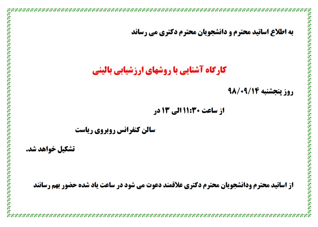 به اطلاع اساتید و دانشجویان محترم دکتری می رساند کارگاه آموزشی آشنایی با روشهای ارزشیابی بالینی با ارائه جناب آقای دکتر هادی حسنخانی روز پنجشنبه مورخه 14 آذر ماه از ساعت 11:30 الی 13 در سالن کنفرانس روبروی دفتر ریاست دانشکده برگزار خواهد گردید.