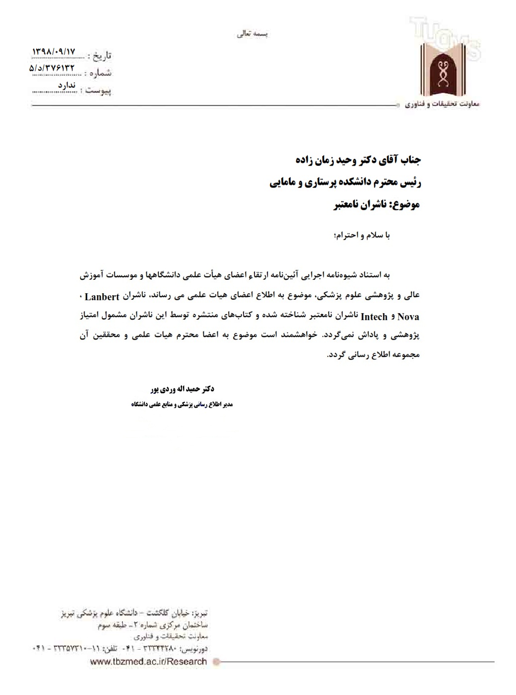 بر اساس اعلام مدیر اطلاع رسانی پزشکی و منابع علمی دانشگاه ناشران Lanbert، Nova و Intech از جمله ناشران نامعتبری معرفی گردیه اند که کتابهای منتشره توسط ایشان مشمول امتیاز پژوهشی و پاداش نمی گردد.