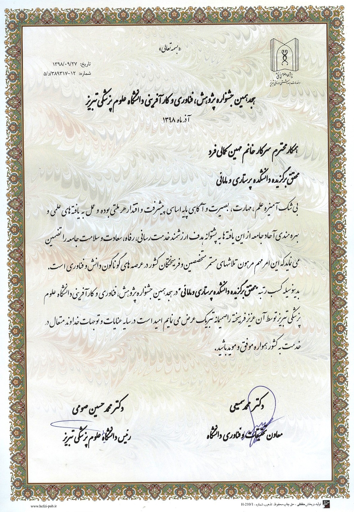 تبریک کسب عنوان محقق برگزیده دانشکده توسط سرکار خانم مهین کمالی فرد