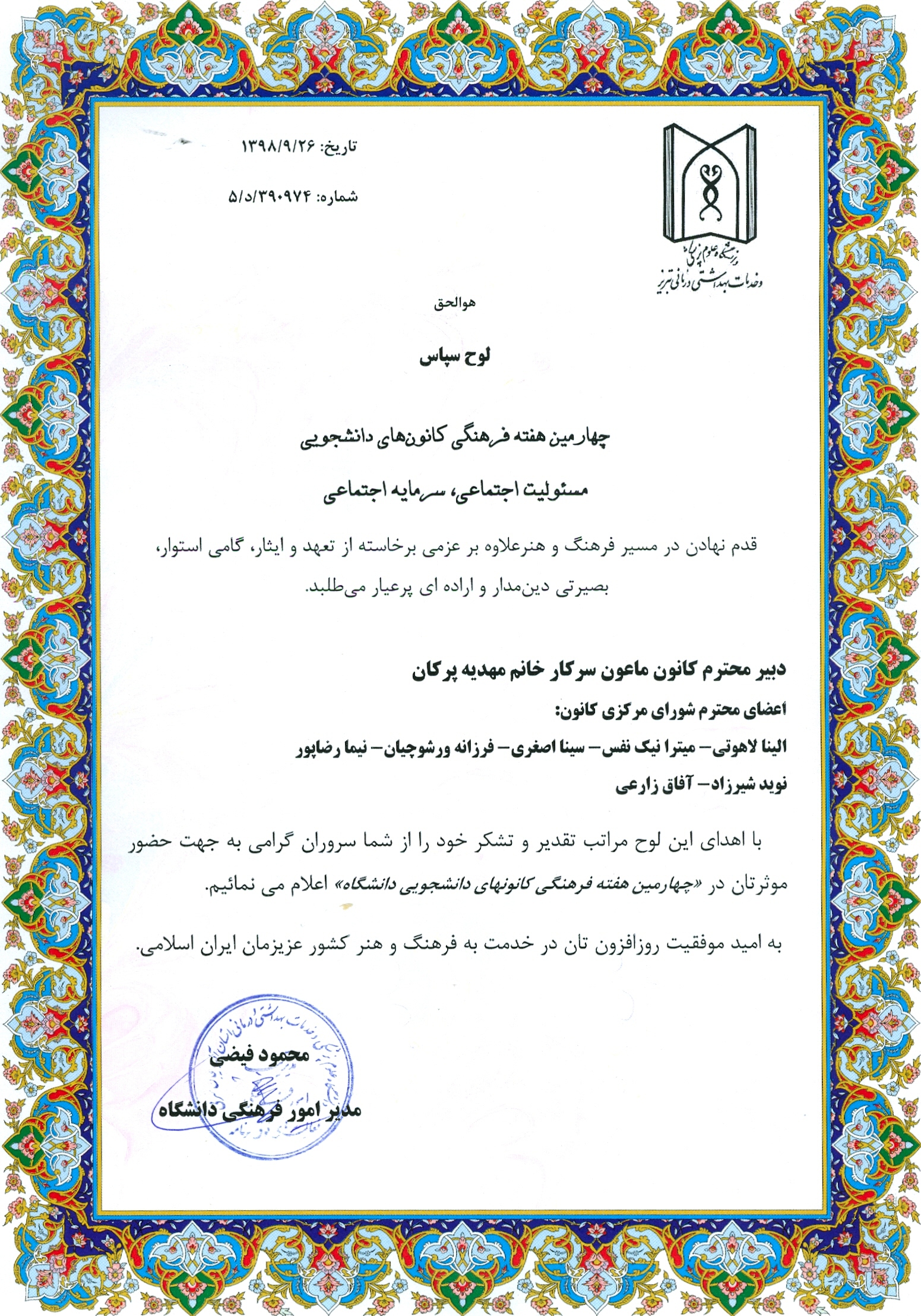 آقای محمود فیضی، مدیر امور فرهنگی دانشگاه با اهدای لوح یادبودی از حضور موثر دبیر و اعضای شورای مرکزی کانون ماعون دانشکده در چهارمین هفته فرهنگی کانون های دانشجویی دانشگاه تقدیر و تشکر نمود.