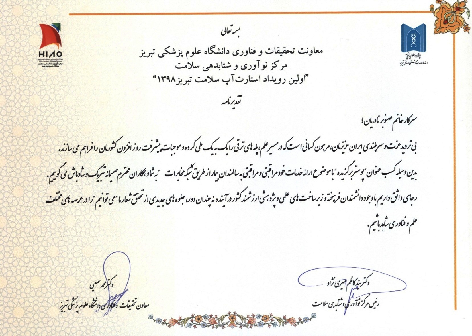 تبریک افتخار آفرینی سرکار خانم صنوبر نادریان در اولین رویداد استارت آپ سلامت تبریز 1398