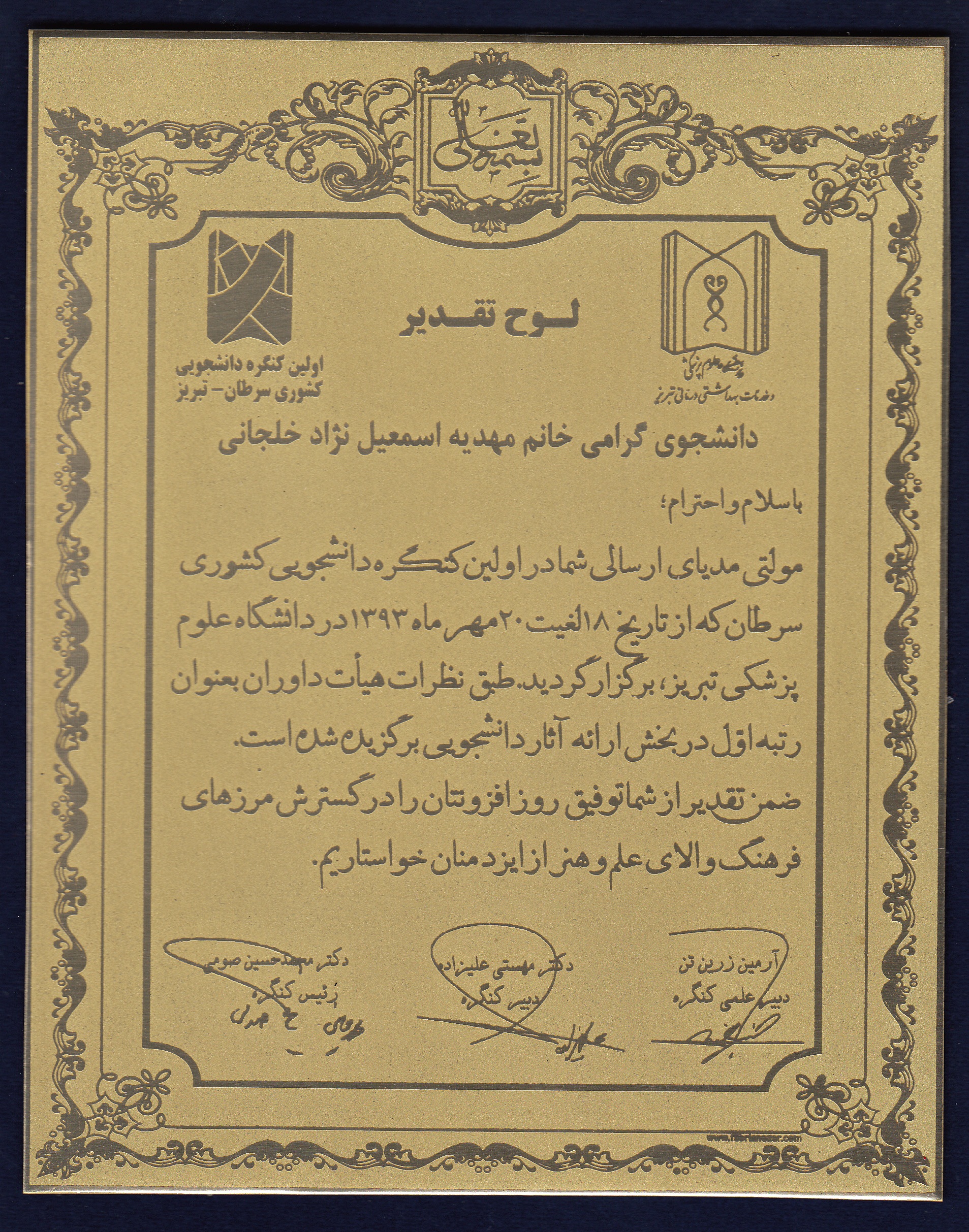 بدینوسیله افتخار آفرینی و کسب رتبه اول کنگره بین المللی دانشجویی سرطان دانشگاه علوم پزشکی تبریز ...