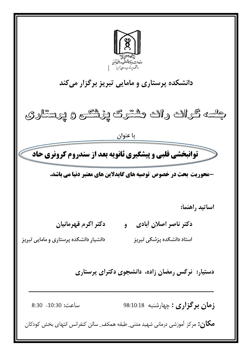 احتراماً به استحضار می رساند گراند راند مشترک پزشکی و پرستاری طرح اتندینگ با مشارکت گروه داخلی جراحی این دانشکده و گروه داخلی قلب دانشکده پزشکی تحت عنوان "توانبخشی قلبی و پیشگیری ثانویه بعد از سندروم کرونری حاد" که با محوریت بحث در خصوص توصیه های گایدلاین های معتبر دنیا می باشد، روز چهار شنبه مورخه 98/10/18 ساعت 8:30 در محل مرکز آموزشی درمانی شهید مدنی، طبقه همکف، سالن کنفرانس انتهای بخش کودکان برگزار خواهد شد. لذا ضمن دعوت از آن مقام محترم، مستدعی است دستور فرمایند اطلاع رسانی لازم به دفتر پرستاری، بخشهای مختلف، دانشجویان پزشکی و پرستاری و پرستاران محترم صورت گیرد.